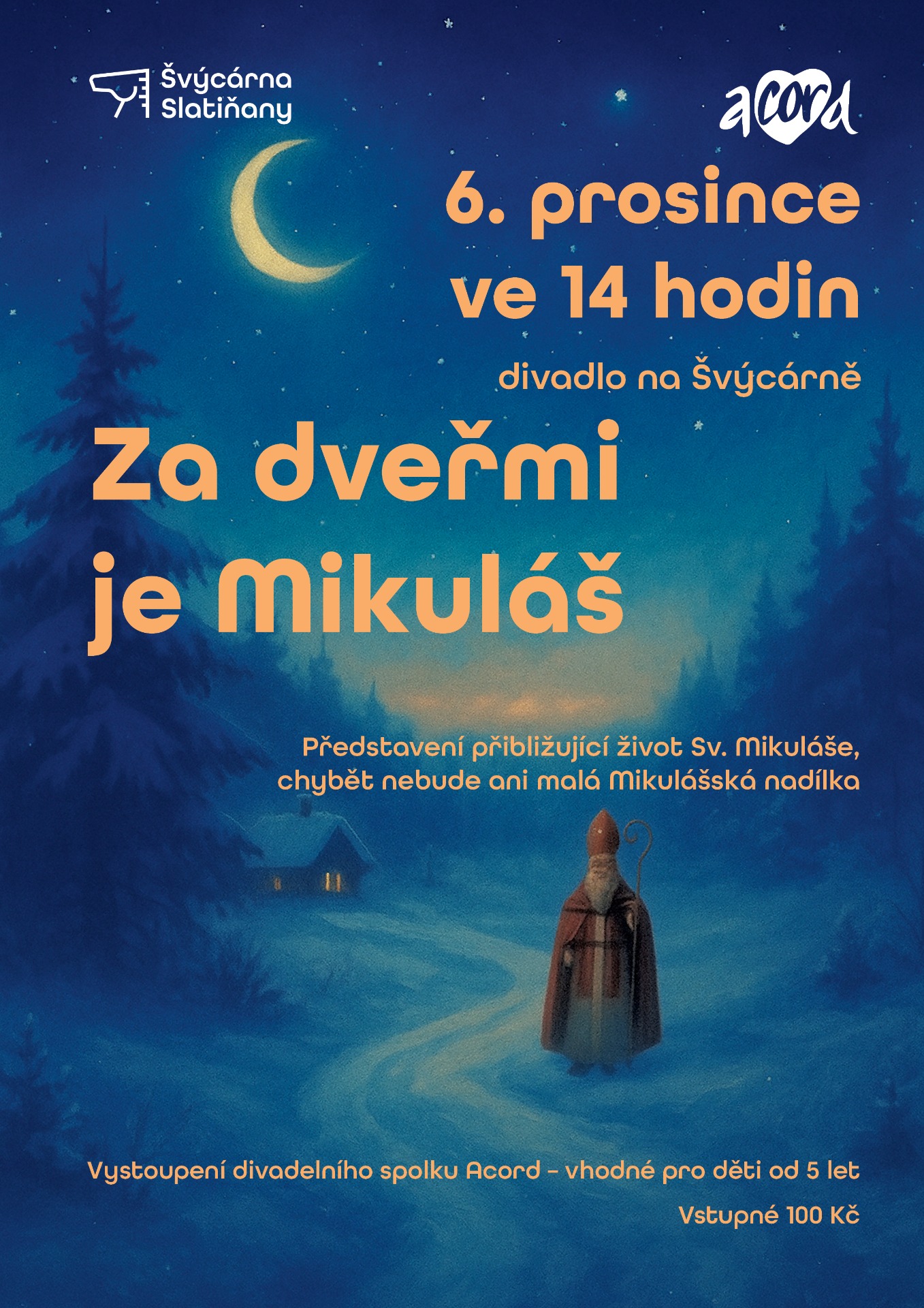 Novou autorskou hru Ivy Ryzové: "Za dveřmi je Mikuláš" Vám zahrajeme na dvou místech. Premiéra bude ve Škrovádě v Hospodě Pod Kopcem 3. 12. 2025 v 17 hodin, druhé provedení se uskuteční na Švýcárně 6.12. ve 14 hodin. S touto divadelní hrou se rozloučíme v pátek 12.12. 2025 v ZŠ Slatiňany, kde budeme hrát pro děti z prvního stupně zdejší základní školy.